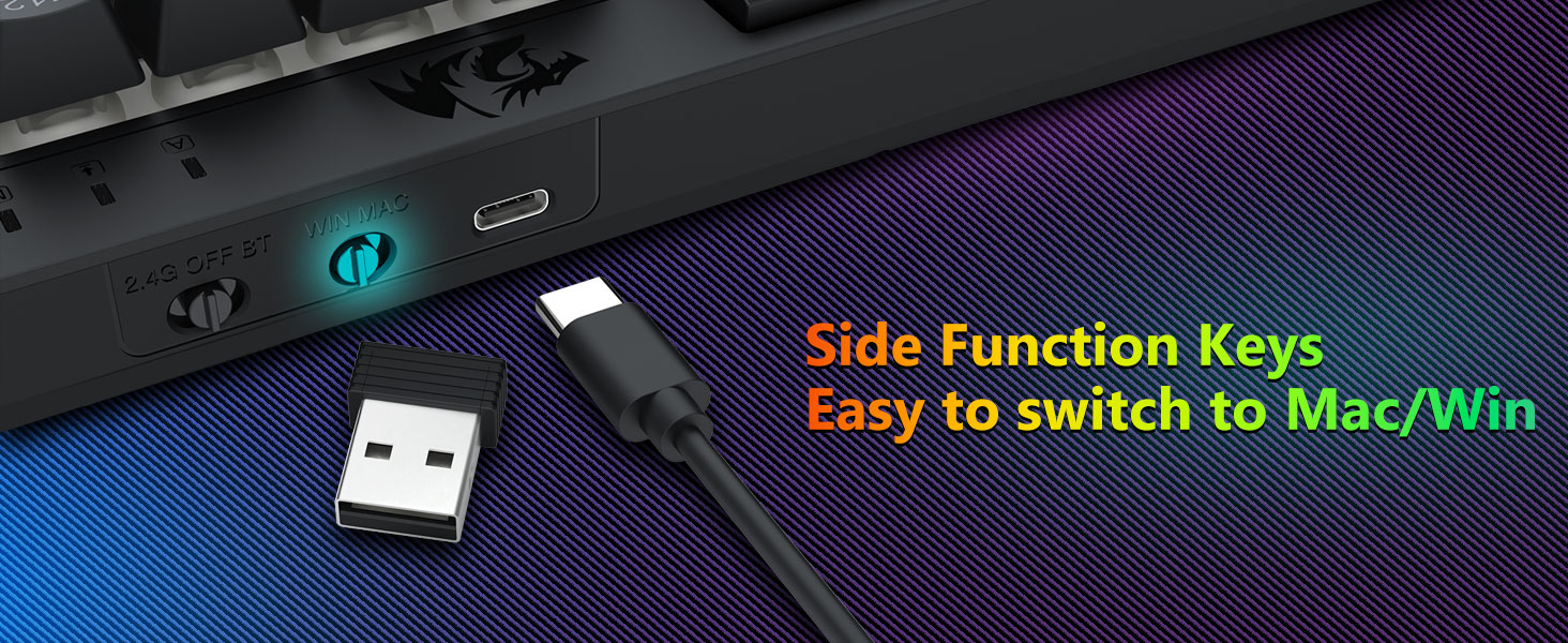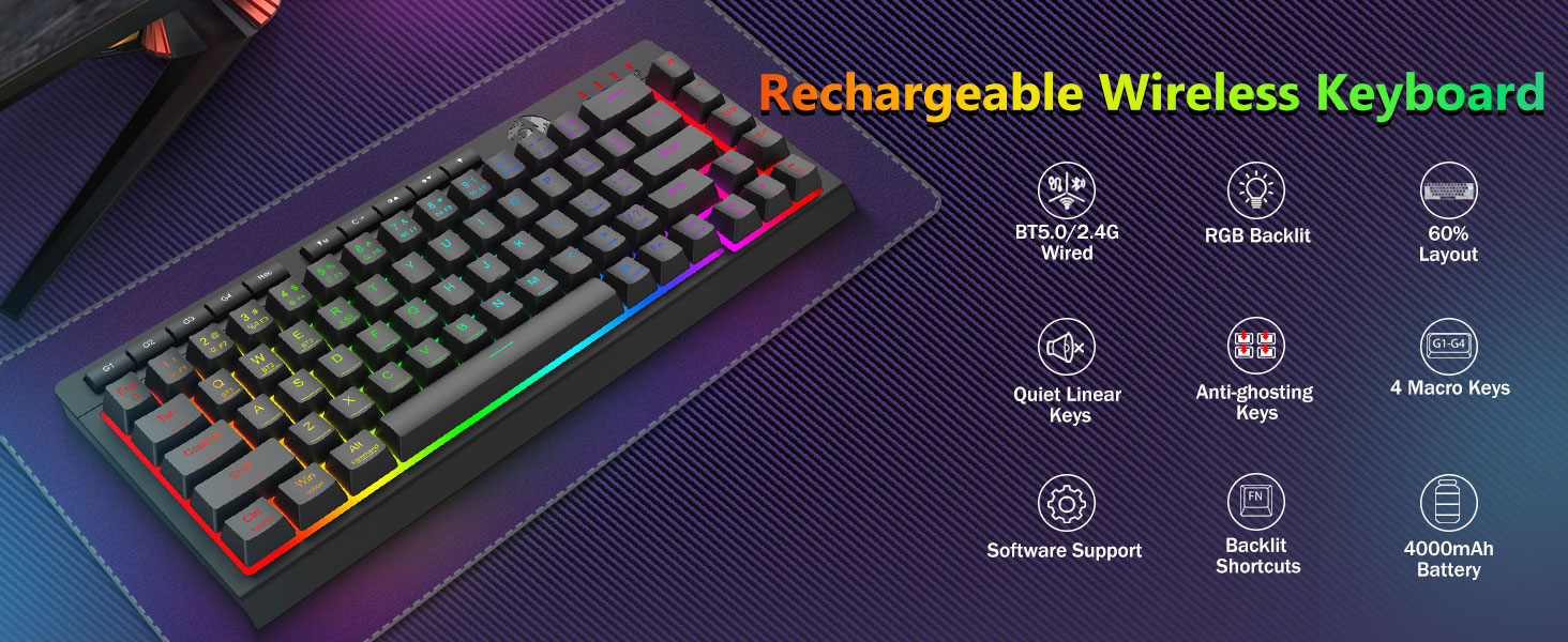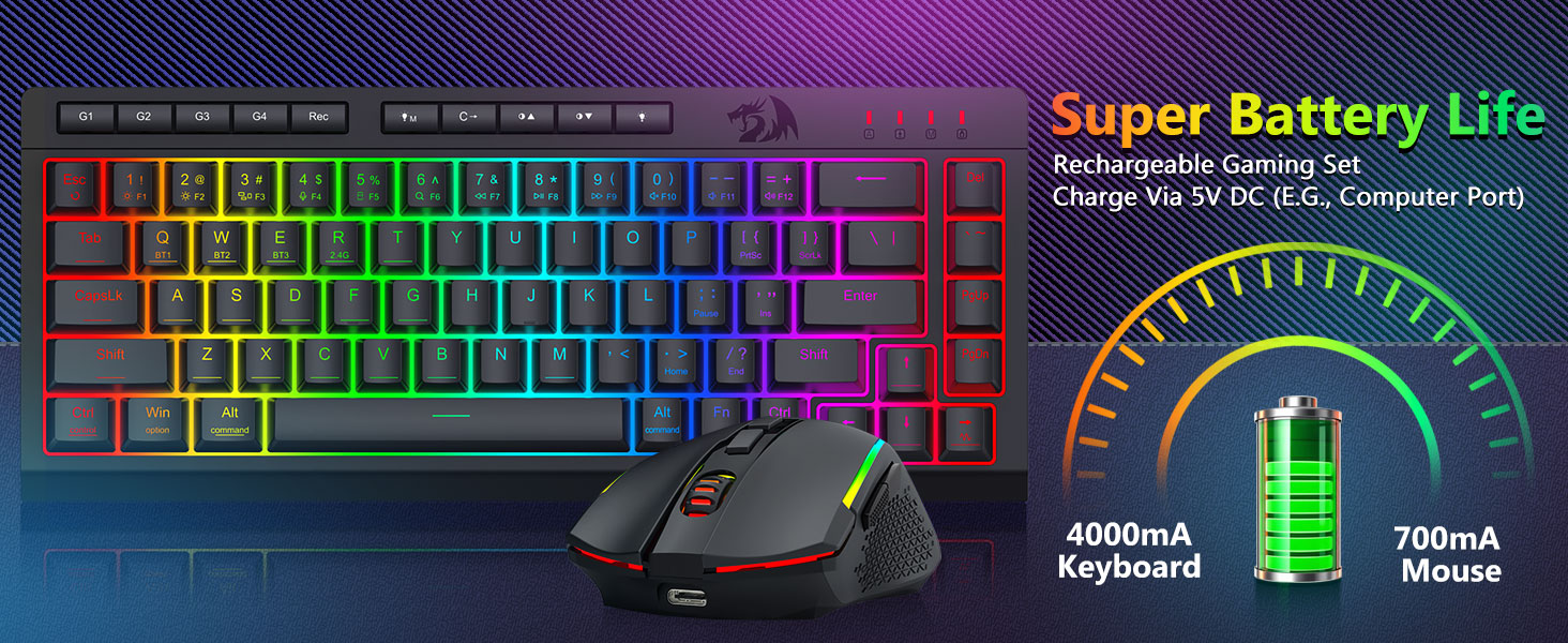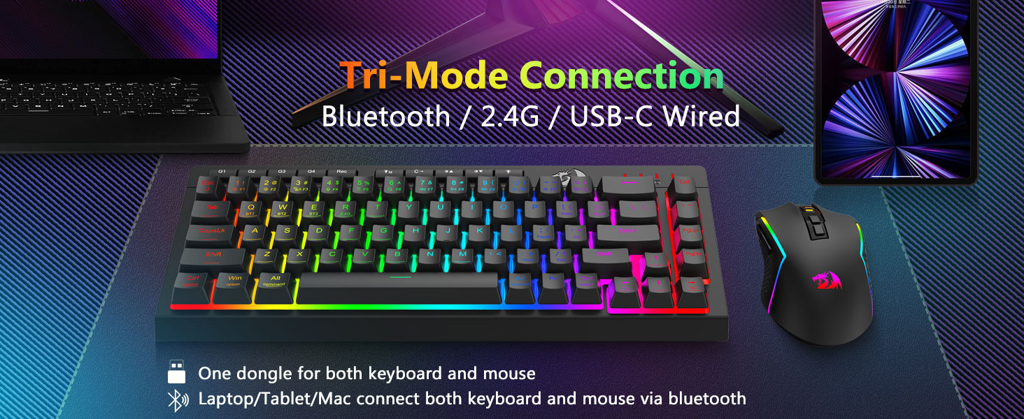 Tri-mode mode cyretitility a me ke kiʻi- E hoʻololi i ka seamlessly ma waena o blnetooth 5.0, 2.4ghz cryless, a iʻole USB-CO i nā polokalamuʻokoʻa. ʻO nā mea hana hoʻowalewale i nā mea kūʻai aku ma o nā kī pōkole a iʻole kaʻaoʻaoʻaoʻao-ʻaoʻao-kūpono no nā hana hana hybrid hana. E hoʻomau i nā uku no nā hebedoma me ka papa pākaukauʻo 4,000mah a me 700mah