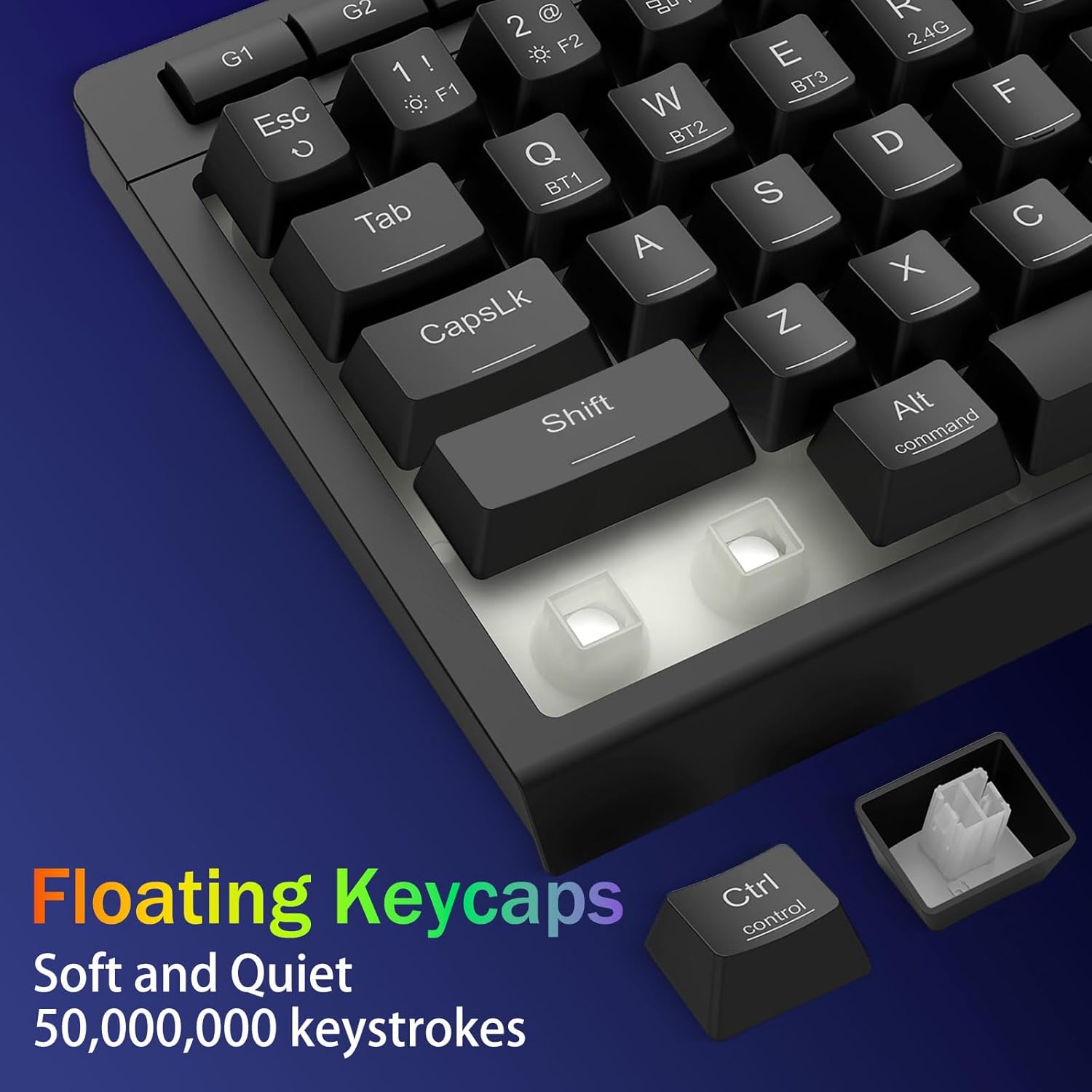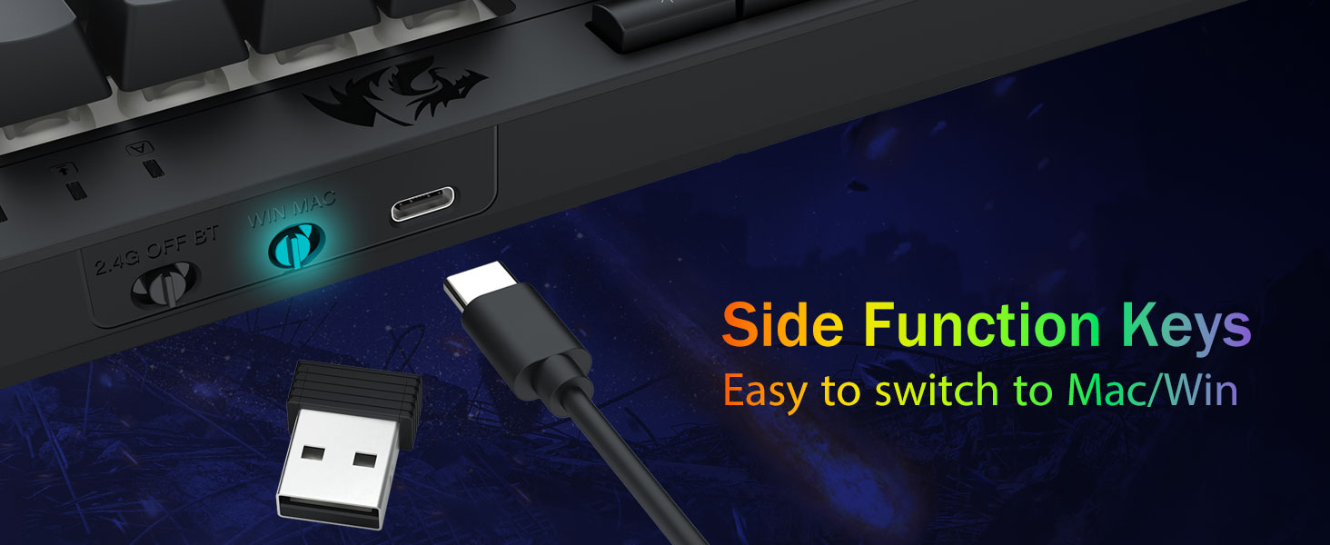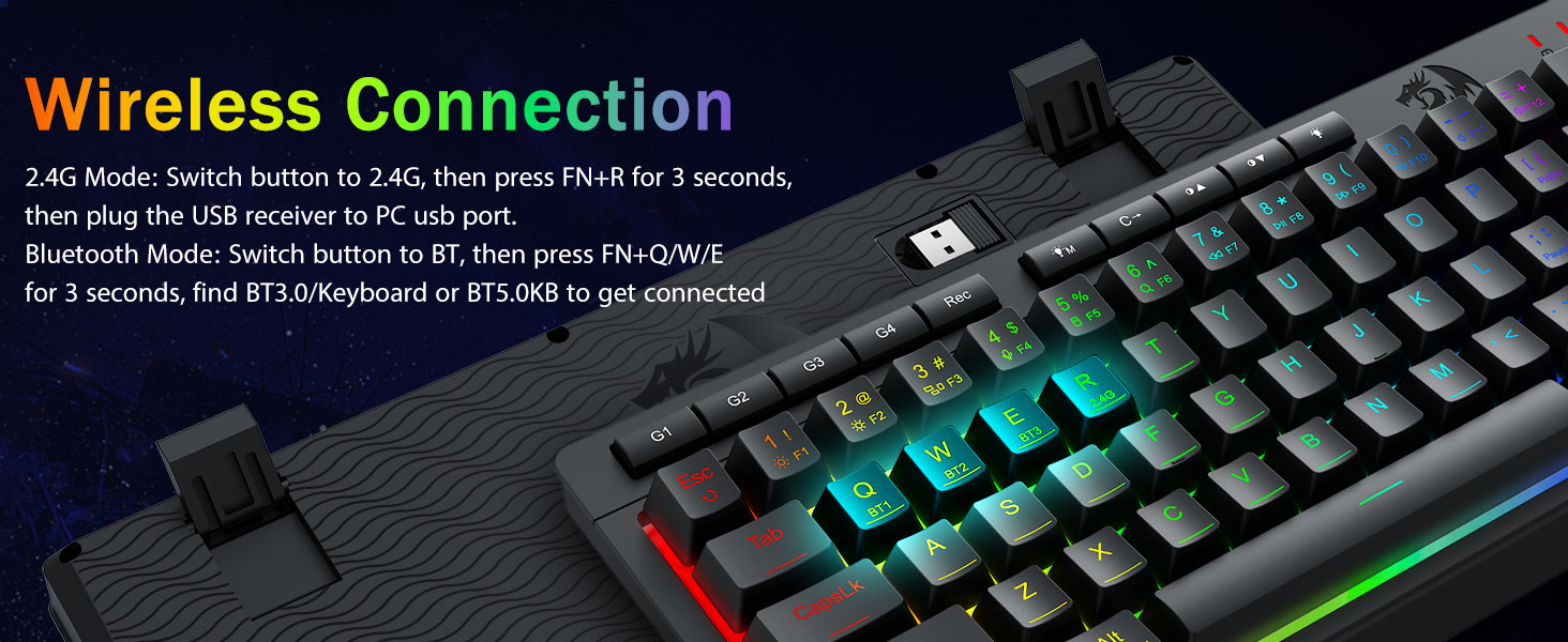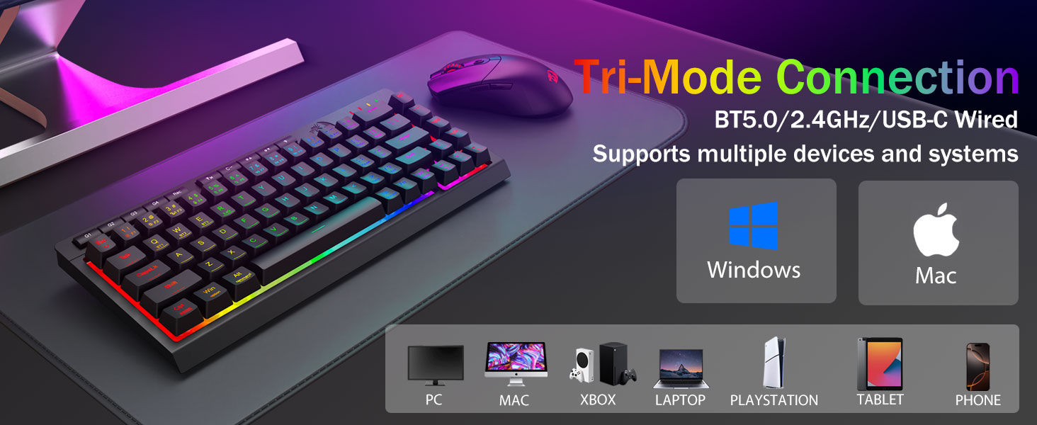 TRI-mode mode VERSITITE & MERUM-PERMER-PERSETY -E hoʻololi i ka hala ma waena o ka blnetooth 5.0, 2.4ghz usless, a iʻole USB-COWS, PS / Xbox). ʻO nā mea hana hoʻowalewale i nā mea kūʻai aku ma o nā kī pōkole a iʻole kaʻaoʻaoʻaoʻao-ʻaoʻao-kūpono no nā hana hana hybrid hana. E hoʻomau i nā hebedoma no nā hebedoma me ka pākaukau 4,000mah (30+ mau lā State, 50hrs RGB Runtime).