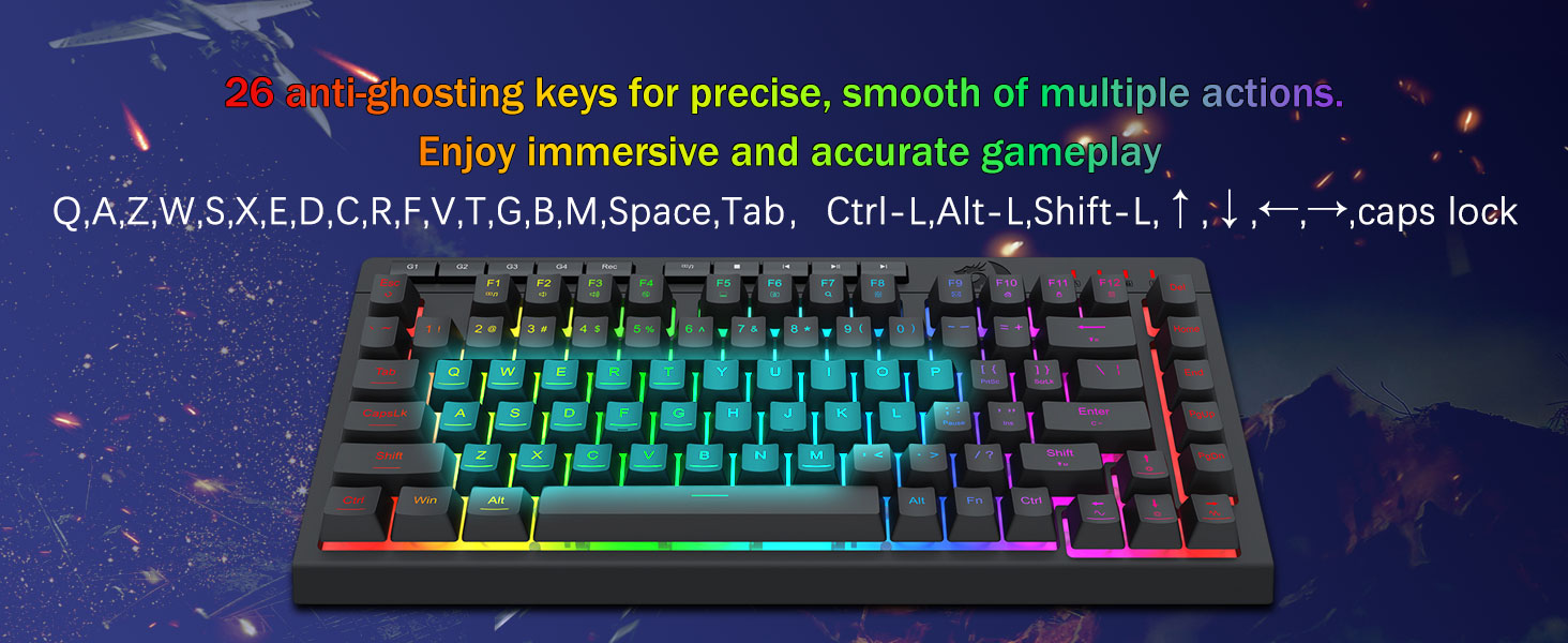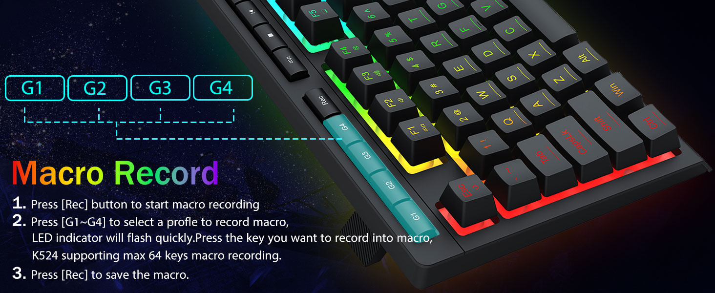 Hāʻawi ke kīʻo K524 i nā kī 4 Fiskmable macro no nā hana wikiwiki. Hōʻikeʻia ia i ka RGB RENTLILIPING me 8 Preset a me 6 mauʻano hana maʻamau a me nā modes a me nā modes a me ka mana kukui kukui. Me 26 26 anti - nā kī nui no nā pane gaming wikiwiki a hoʻolaʻaʻia, e hōʻoia i ka gameplayplay. Hāʻawi ka hoʻololiʻana o ka pāʻani pāʻani ma waena o ka hanaʻana i ka hanaʻana, kūpono, kūpono no nāʻano likeʻole, a loaʻa iā 50 Loaʻa ka polokalamu i ka hana hou aku no ka maʻamau.