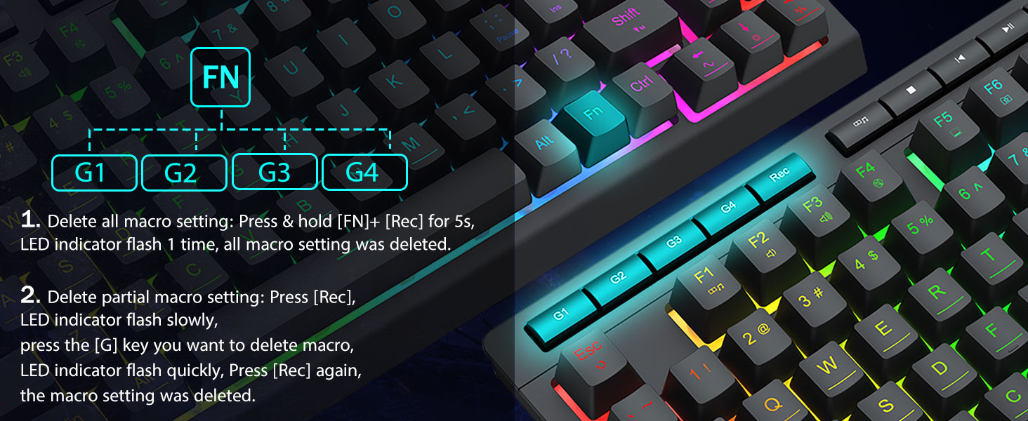4 Nākiena ma Matro matro mas -ʻO 4 mau kī ma Macroboard (G1 ~ G4) e hoʻolālā a hana ma ka lele me kahi polokalamu houʻole. He mea maʻalahi nā kī e hoʻoponopono a hiki ke hana i nāʻano likeʻole o nā macros likeʻole.