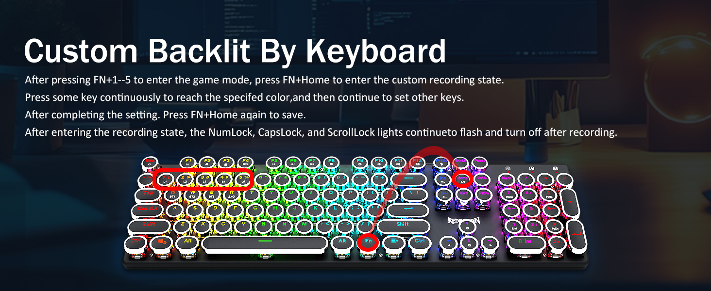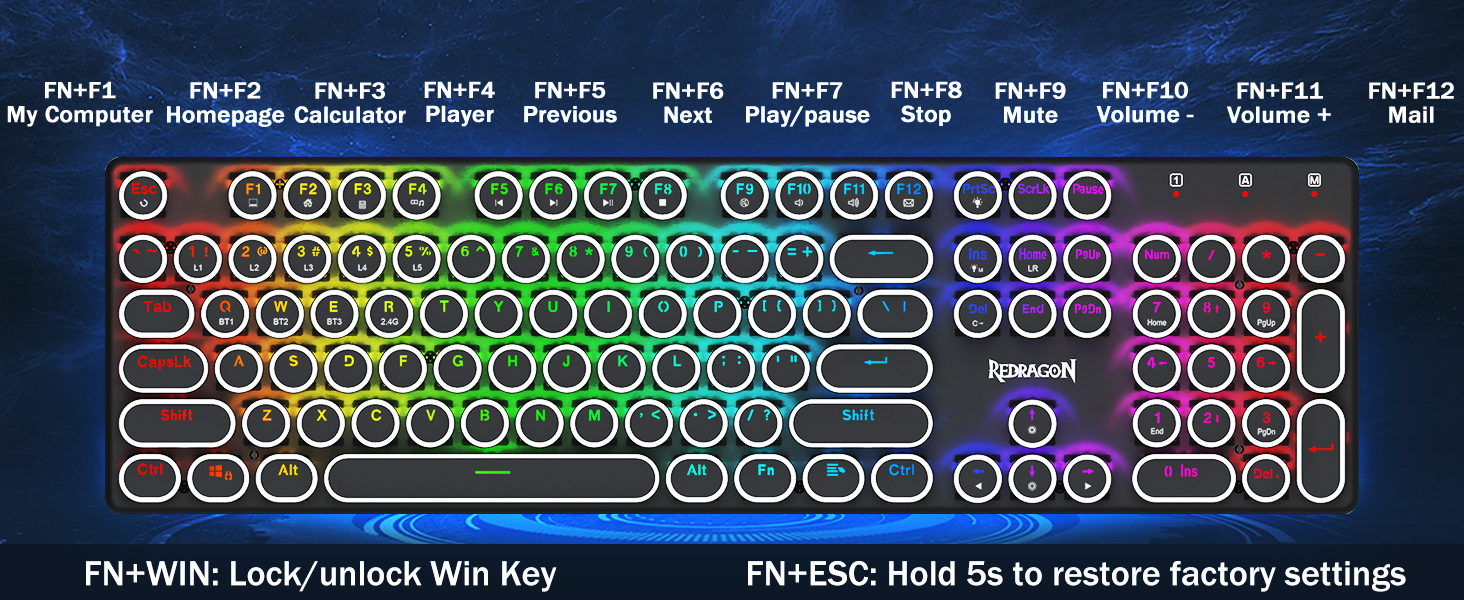 𝟯2 𝗠𝗼𝗱𝗲𝗠𝗼𝗱𝗲 -ʻO nā mea hana me Redragon innvative Ten-Modectic Tic-Moded Connecticut E kaomi FN + Q / W / E E ELSOTH MODE, kaomi FN + R i ka 2.4G mode.