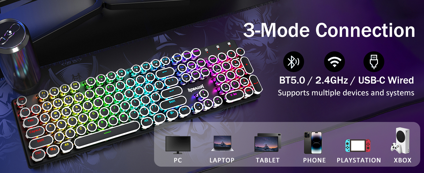 ʻO ka Redragon K723 he kiʻekiʻe Hāʻawi ia iʻekolu mau pilionaʻekolu: BT5.0, 2.4ghz Wireless, a me USB WEDER, eʻae iāʻoe e hoʻohui i nāʻelima mau mea hou. Hoʻololi ma waena o lākou e hoʻohana ana i ka hoʻohanaʻana i nā hui a me ke kī.