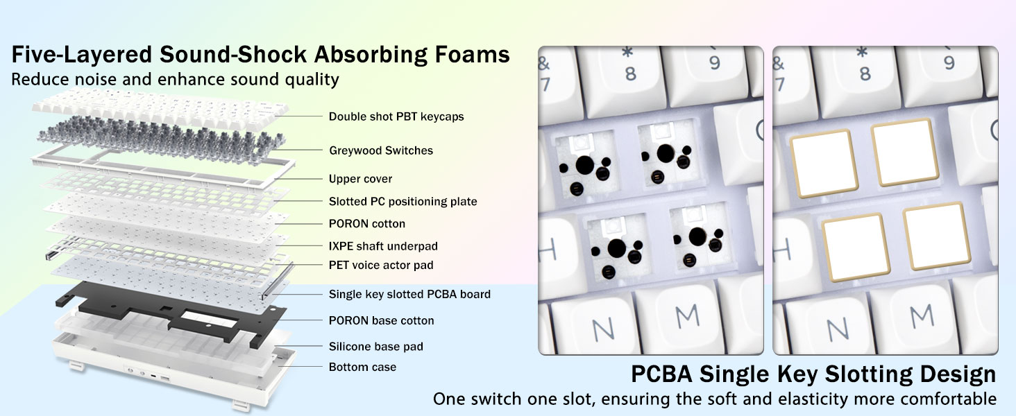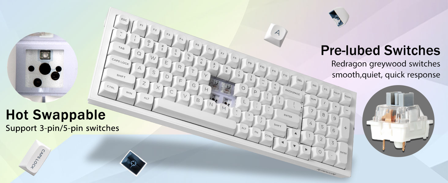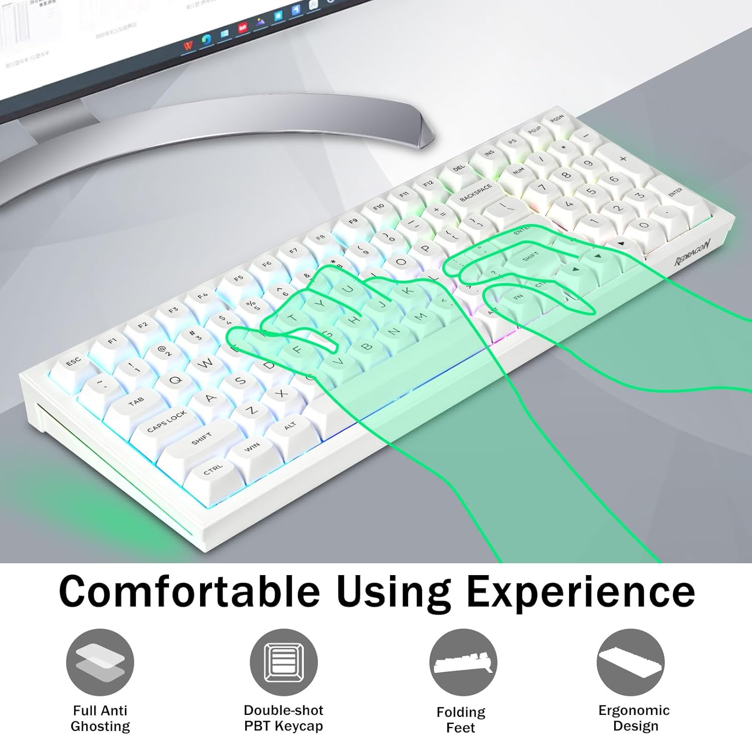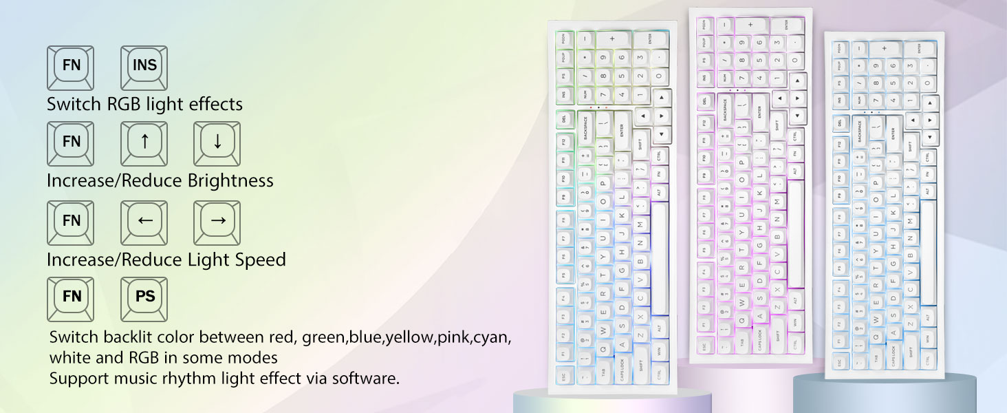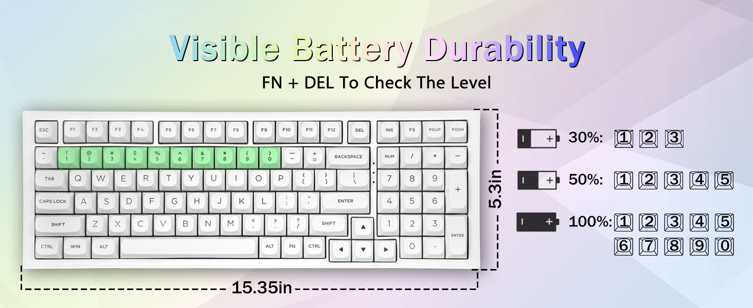 PBT Keycaps a me 4000mah ka pākuhi:99 Key Key 96%ʻO nā'ōkuhi hiki ke mālama i ke kīpē e hiki ke mālama i nā wahi papa e mālama ai i nā kī nui a me nā helu helu no nā pāʻani a me nā hana. ʻO ka pākuhi Rechargeable i kūkuluʻia-ma 4000mah Burccaity nui i ka pākīpōpō nui e hāʻawi i kahi mana hou a me ka lōʻihi o ke ola. Ua loaʻaʻelua mau pahu PBT PBT, i hanaʻia mai nā'āpanaʻelua i nā mea i laweʻia i loko o kekahi, e hana i nā kiʻina nui e mālama ai i ka cherrance a me ka saturation.