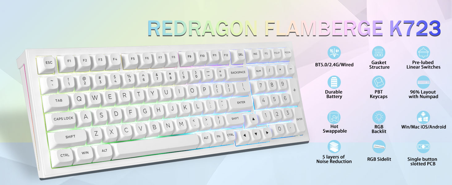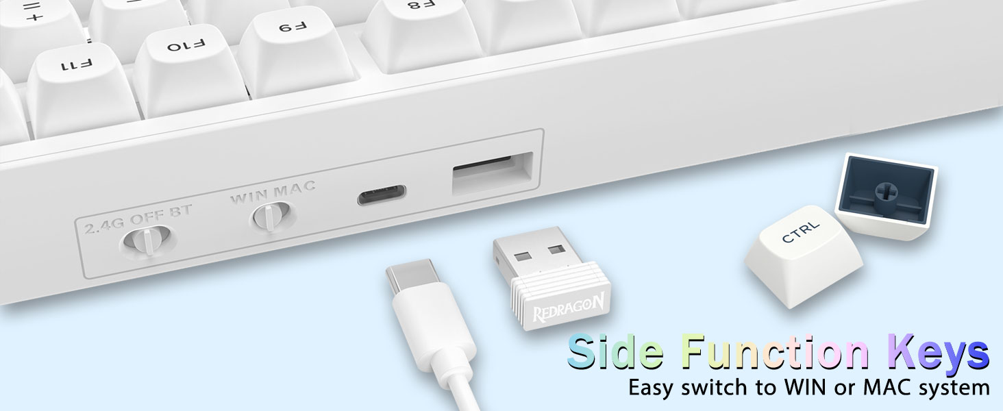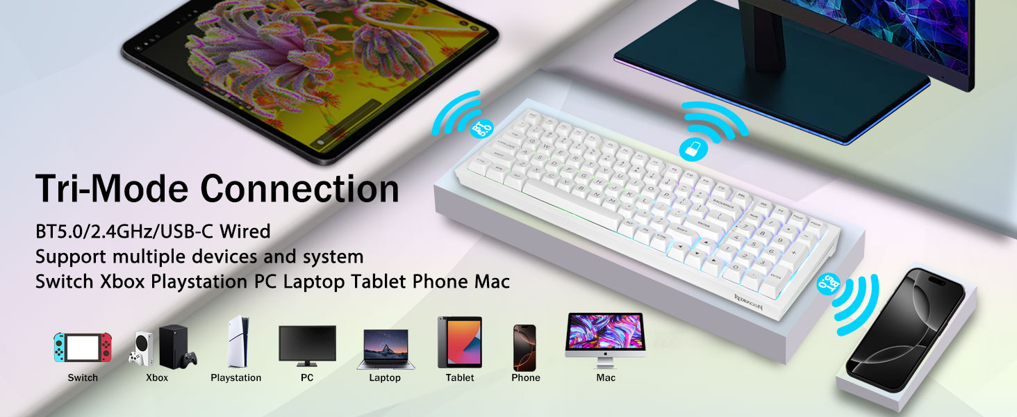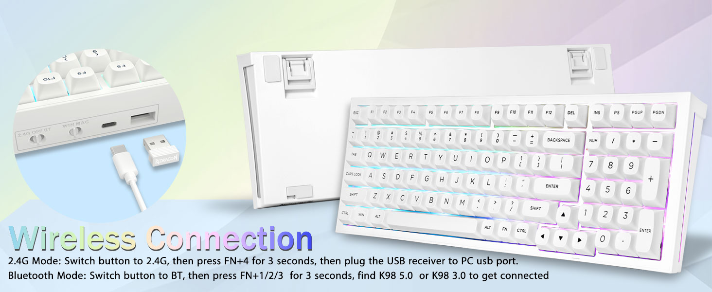 ʻO ka Redragon K723 he kiʻekiʻe Hāʻawi ia iʻekolu mau pilionaʻekolu: BT5.0, 2.4ghz Wireless, a me USB WEDER, eʻae iāʻoe e hoʻohui i nāʻelima mau mea hou. Hoʻololi ma waena o lākou e hoʻohana ana i ka hoʻohanaʻana i nā hui a me ke kī.