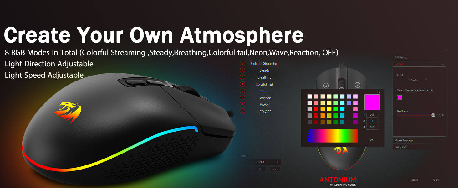 ʻO ke kiʻi houʻo Redragon M719 i koho nuiʻia no nā mea pāʻani. He 5 mau pae kiʻekiʻe (400 - 4000) a me 4 mau koho koho (125 - 1000hz) no ka neʻe wikiwiki. ʻO nā pihi hoʻopiʻi, komo pū me Rapid - Kākoʻo a me nā macro a me nā mea ma Macro, e paʻa hou ana. Me 8 rgb backlit modes, he nani ia. ʻO ka hoʻolālā hoʻolālā Ergonomic e hōʻoluʻolu i ka wā lōʻihi o ka lōʻihi. Kūpono me nā'ōnaehana lehulehu.