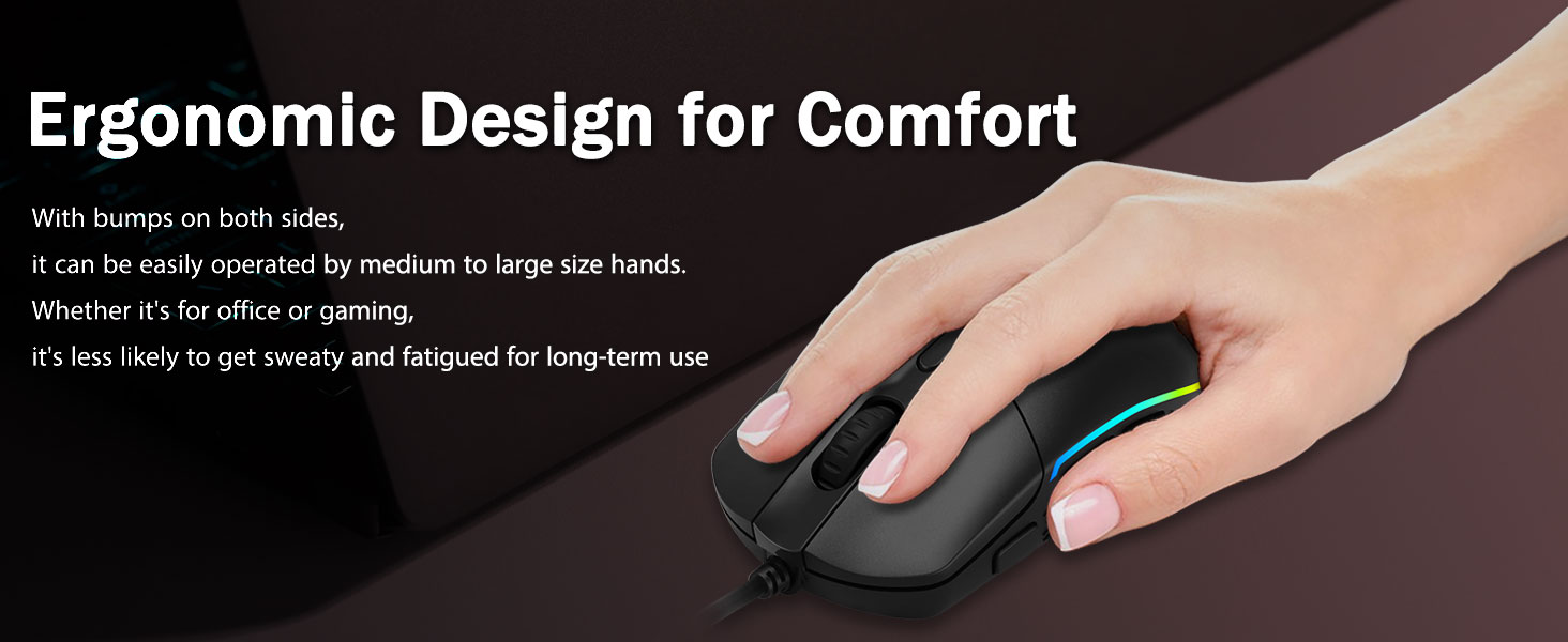 Hōʻoluʻolu grip-ʻO nā pahu ergonomic ma nāʻaoʻaoʻelua e hana i nā mice Game Gaming ma kekahi lima. Hāʻawi ia i ka hōʻoluʻolu lōʻihi loa no nā mea pāʻani, me kaʻole o ka momona i ka wā lōʻihi o nā hola lōʻihi. ʻAʻole ia e huki i ka wā e hāpai ana i ke kiʻi pāʻani pāʻani, a iʻole ke hana wikiwiki a me nā scoine filse.